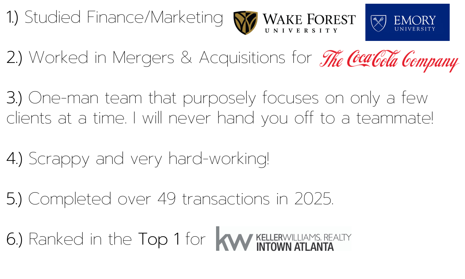 Having graduated from Wake Forest University, I have spent my entire professional life in Atlanta. I started with The Coca-Cola Company working within their Mergers & Acquisitions group but never truly found my passion within the corporate world. I pursued graduate school at Emory University but it wasn't until I was introduced to Real Estate that I finally found a true source of passion. Having worked many years in both Residential and Commercial Real Estate, I can truly say that I found a profession for which I am truly passionate about. Whether it's helping a client find their dream home, negotiating a fair price, navigating daunting home inspections, I feel an immense amount of pride in helping my clients in the entire home selling and buying process.